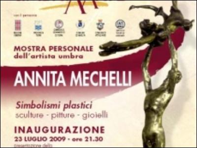 (PTN) TERNI Sarà inaugurata giovedì prossimo alle 21.30 al museo archeologico di Amelia la personale dellartista umbra Annita Mechelli dal titolo Simbolismi Plastici. La mostra, presentata da Anna Iozzino, è un connubio di sculture, pitture e gioielli ed è in programma fino al 16 agosto. Orari di visita: 10,30-13,00 / 16,30-19,00.